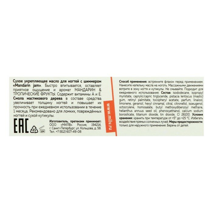MILV Сухое укрепляющее масло для ногтей с шиммером «MANDARIN JAM». 15 мл интересное: