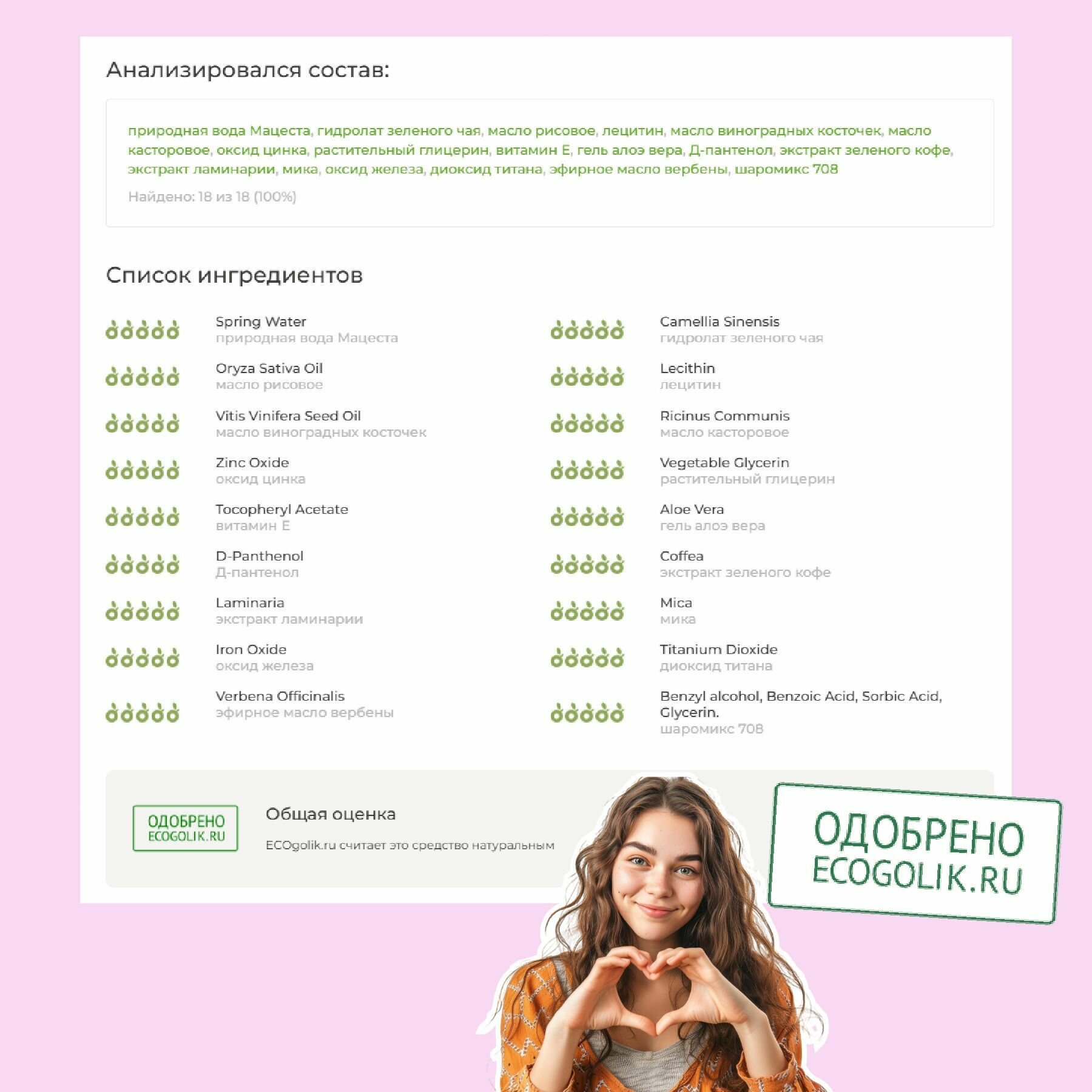 | Состав | Горная вода, масло рисовое, лецитин (растительный), масло ши, оксид цинка, витамин Е, гель алоэ вера, Д-пантенол, морской коллаген, растительный глицерин, экстракт ламинарии, экстракт зеленого кофе, экстракт яблони, мика, оксид железа, диоксид титана, эфирное масло миндаля, бензиловый спирт, этилгексилглицерин (натуральный консервант). |