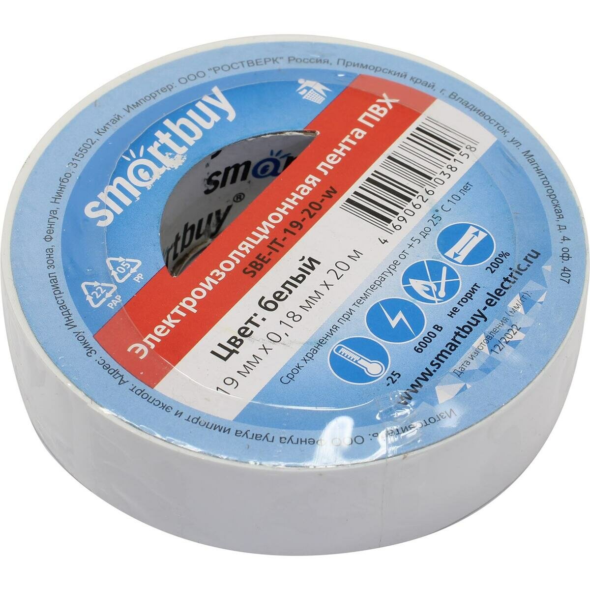Изолента Smartbuy, 0.18х19мм, 20 метров, белая (SBE-IT-19-20-w)
