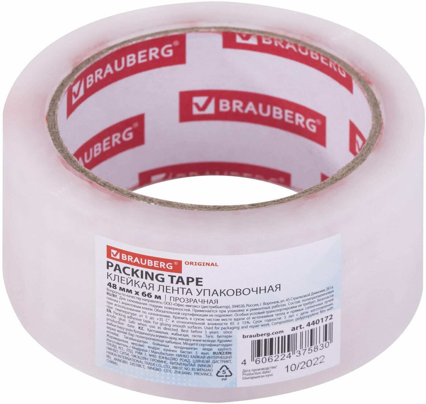 Клейкая лента упаковочная 48 мм х 66 м, прозрачная, толщина 45 микрон, BRAUBERG ORIGINAL, 440172