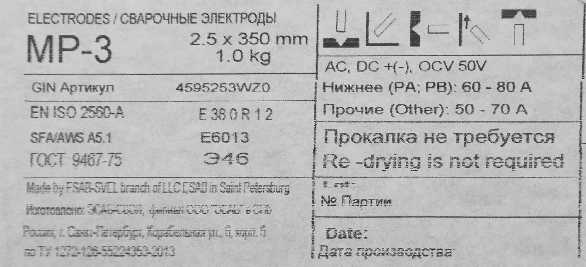 | Дополнительная информация | Электроды сварочные ESAB МР-3 2,5x350мм 1,0кг |