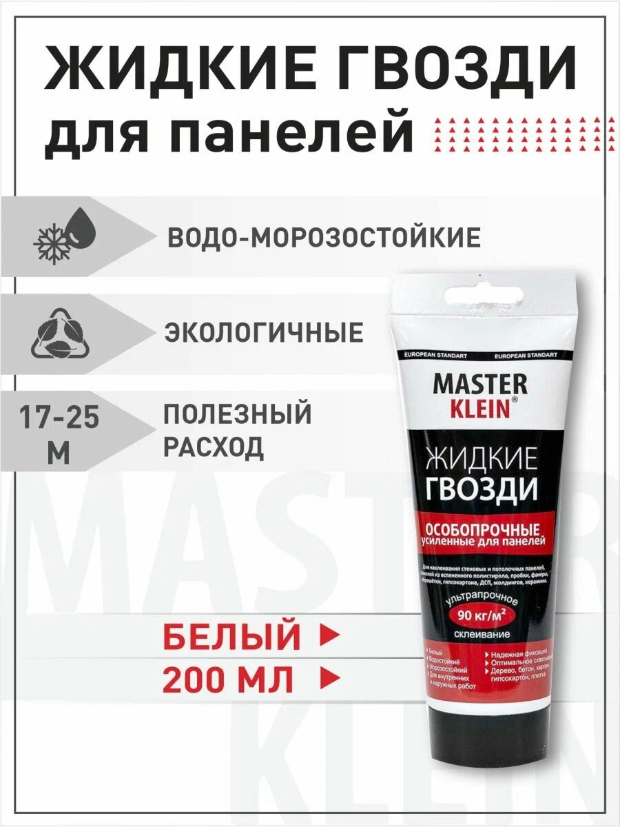 Ниже Вы можете прочитать отзывы на Жидкие гвозди особопрочные для панелей "Master Klein" 200мл./ 300гр., ознакомится с подробными характеристиками, посмотреть интересные обзоры и фотографии на Жидкие гвозди особопрочные для панелей "Master Klein" 200мл./ 300гр..