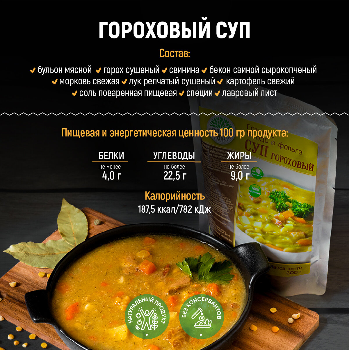 | Состав | горох сушеный, свинина, бекон сырокопчёный, вода питьевая, морковь свежая, картофель свежий, лук репчатый сушеный, масло растительное, соль поваренная пищевая, специи, лист лавровый |