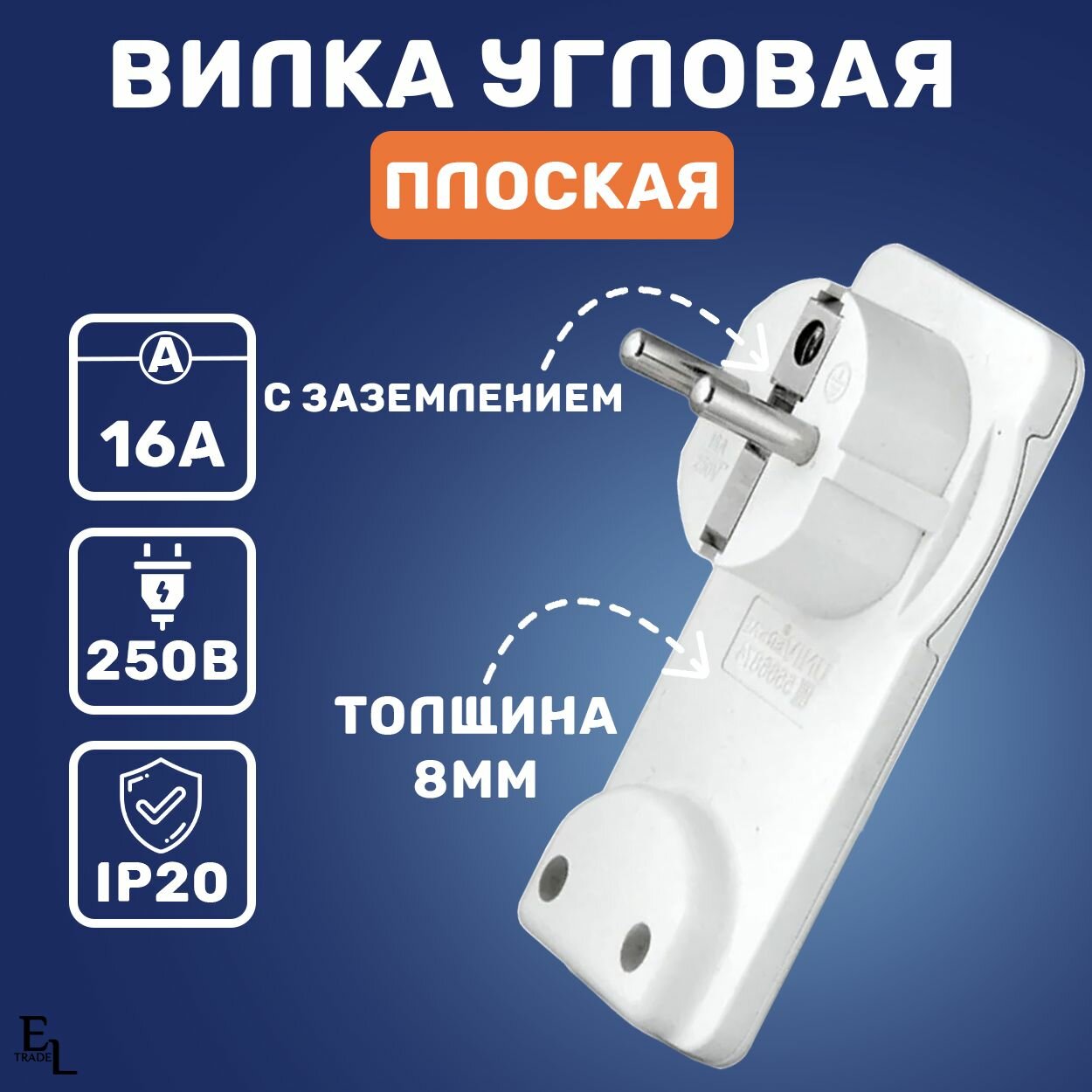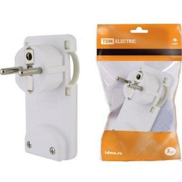 Вилка угловая плоская (8 мм) белая 16А 250В TDM