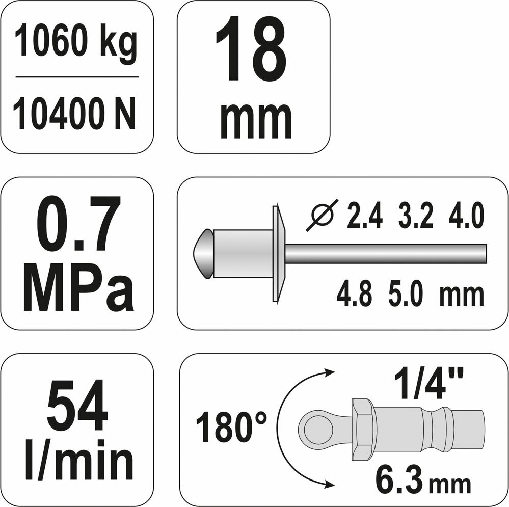 Заклепочник пневмогидравлический 2,4 - 5мм 0,7MPa 54л/мин 18мм 10,4кН YATO YT-36171 | цена за 1 шт