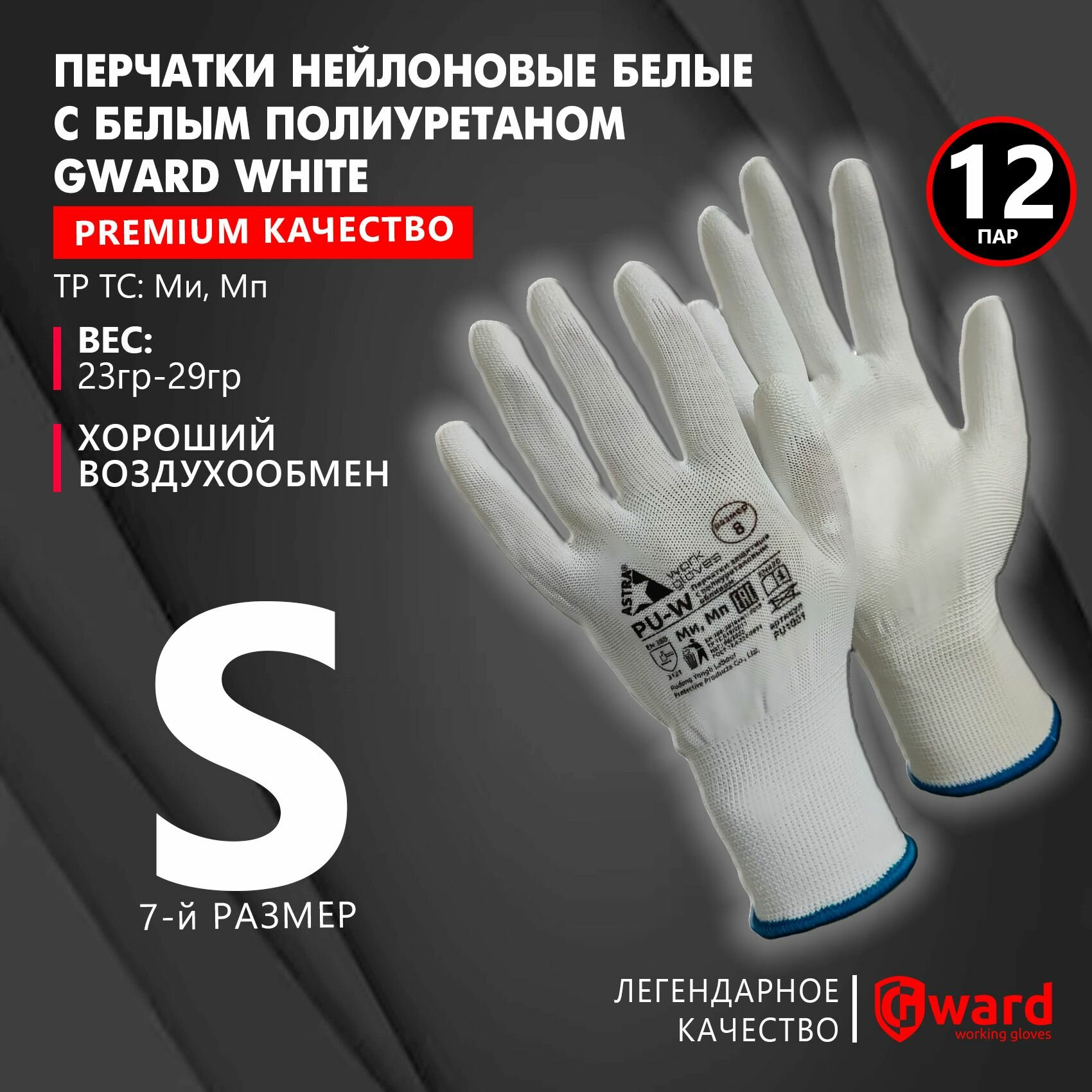 Нейлоновые перчатки с полиуретановым покрытием Gward белые, р.S, 12 пар PU1001