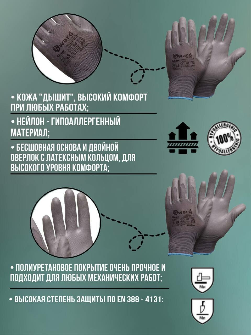 Перчатки нейлоновые с полиуретановым покрытием, рабочие, хозяйственные Gward Grey PU1001 серого цвета, размер 8 (М), 12 пар