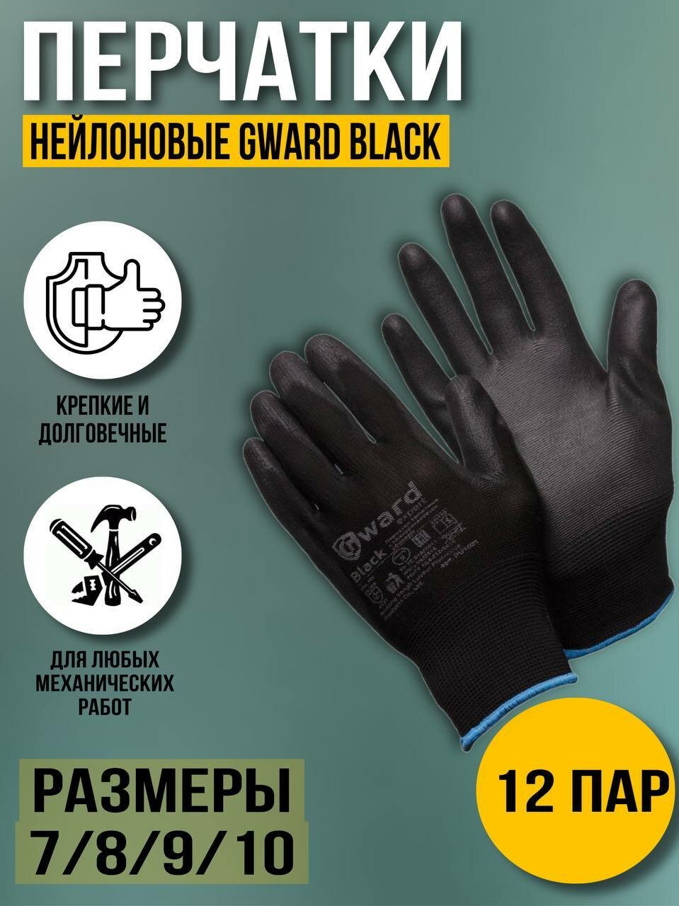 Перчатки нейлоновые с полиуретановым покрытием, размер M Gward Black черные, 12 пар.