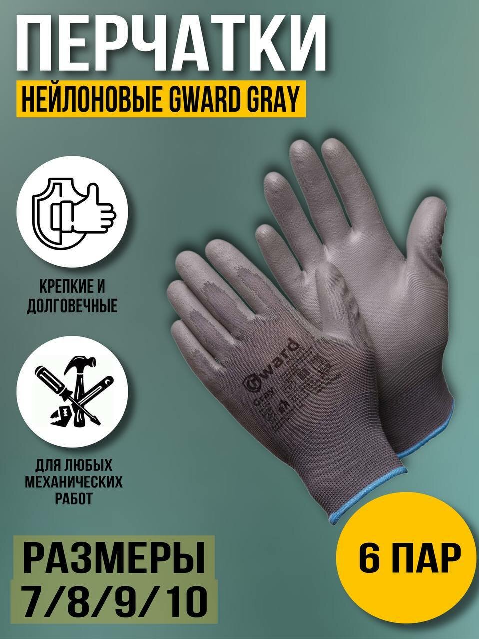 Перчатки нейлоновые с полиуретановым покрытием, рабочие, хозяйственные Gward Grey PU1001 серого цвета, размер 7 (S), 12 пар