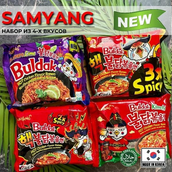 Купить Корейская лапша быстрого приготовления SAMYANG 2х spicy, 3x spicy, Кимчи, Хабанеро лайм(набор 4 шт)