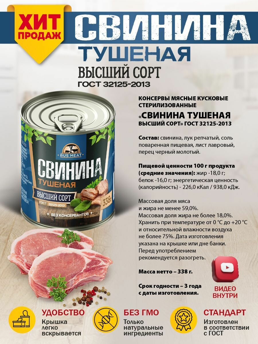 Свинина Тушеная Высший Сорт ГОСТ RusMeat 338 гр. - 8 шт. интересное: