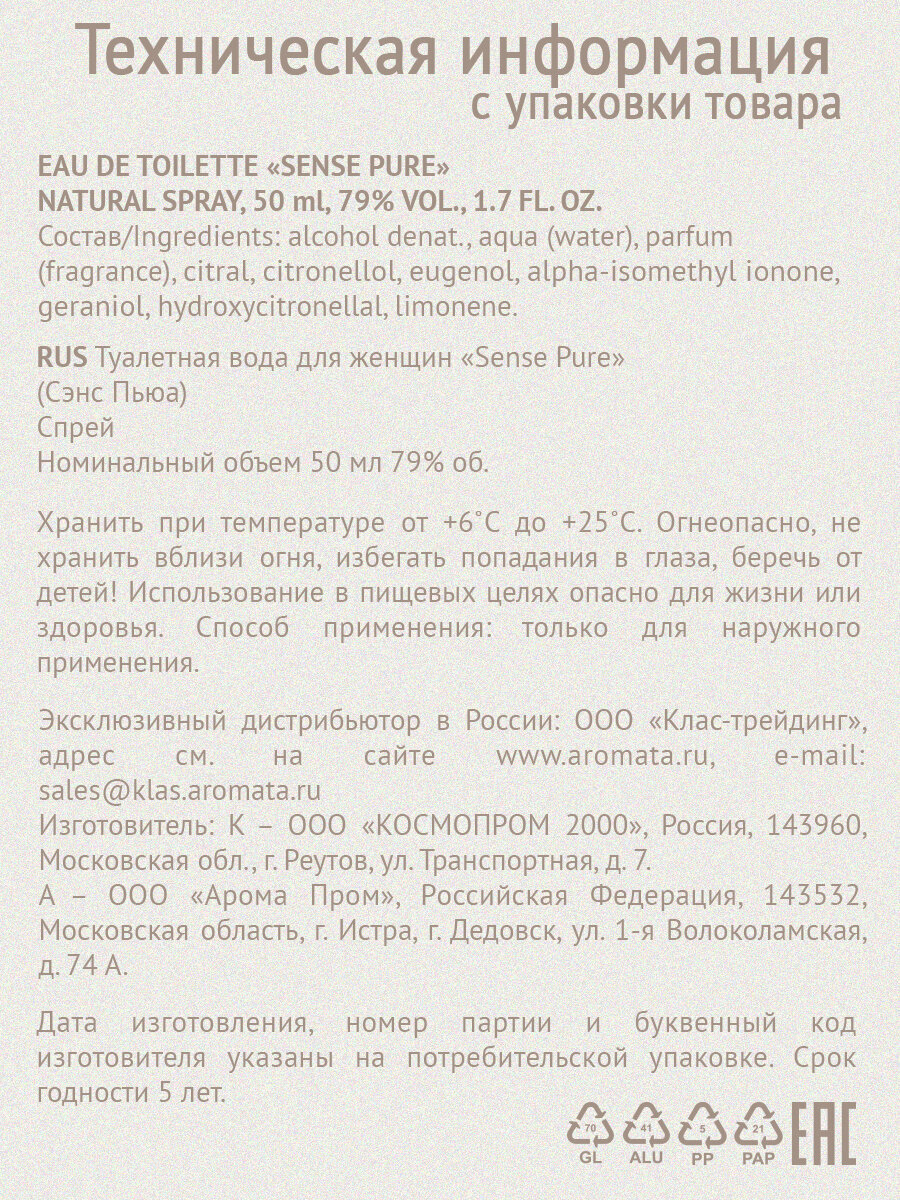 Женские духи Sense Pure - аромат свежести и чистоты! интересное: