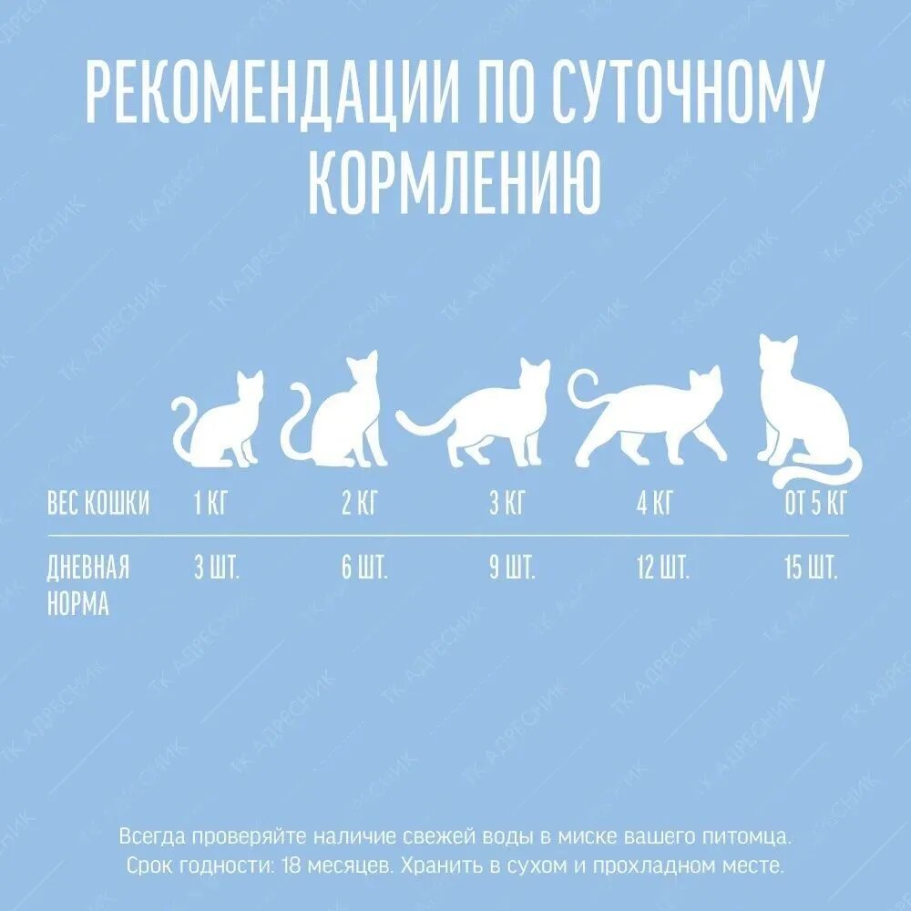 | Дозировка | см. таблицу. Корм готов к употреблению. Проследите, чтобы у вашей кошки всегда была свежая вода. |
