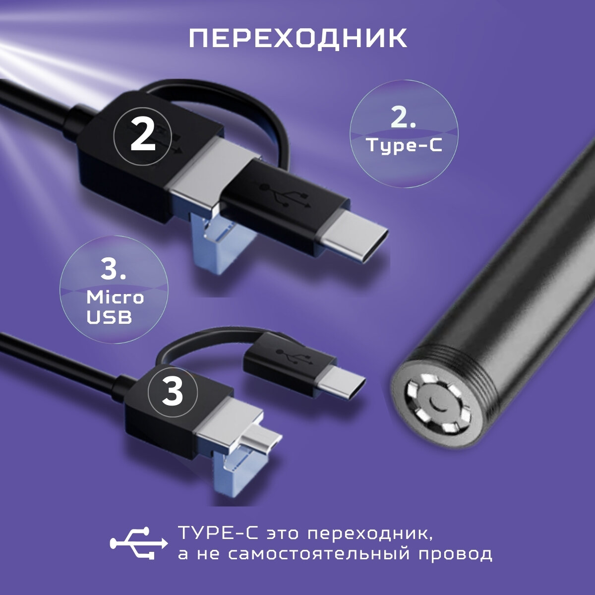 | Комплектация | Видеоэндоскоп 1шт, кабель Micrо-USB / USB / TYPE-C 1шт, переходник 1 шт, насадки 3 шт |