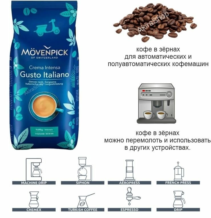 Кофе в зёрнах 1 кг MOVENPICK Crema Gusto Italiano, Мовенпик смесь зерен арабики и насыщенных зерен робусты, из Финляндии