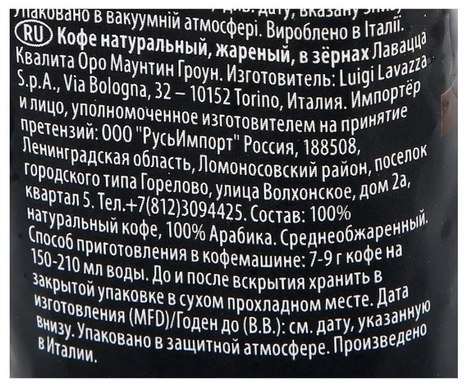 Кофе в зернах Lavazza Qualita Oro Mountain Grown INT, пачка 250r