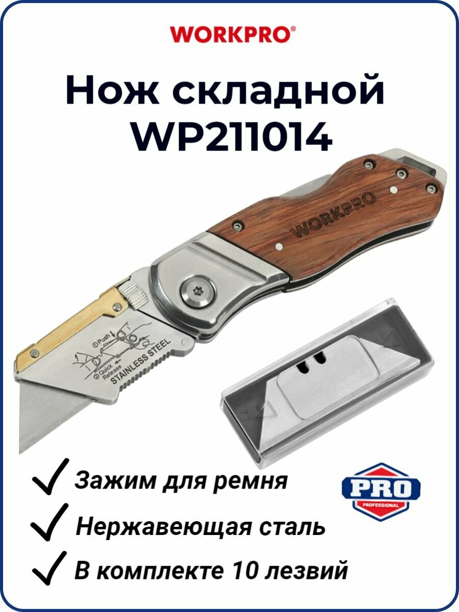 Купить Складной нож WORKPRO ручка из дерева, 10 лезвий, трапециевидные лезвия WP211014