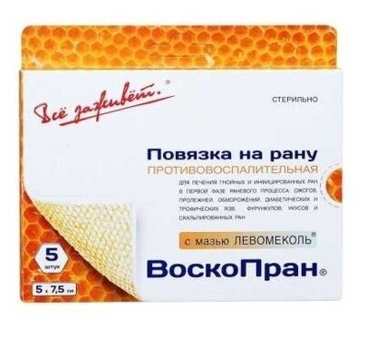 ВоскоПран с мазью Левомеколь (Левометил) - противовоспалительная раневая повязка, 5x7,5 см (5 шт.)