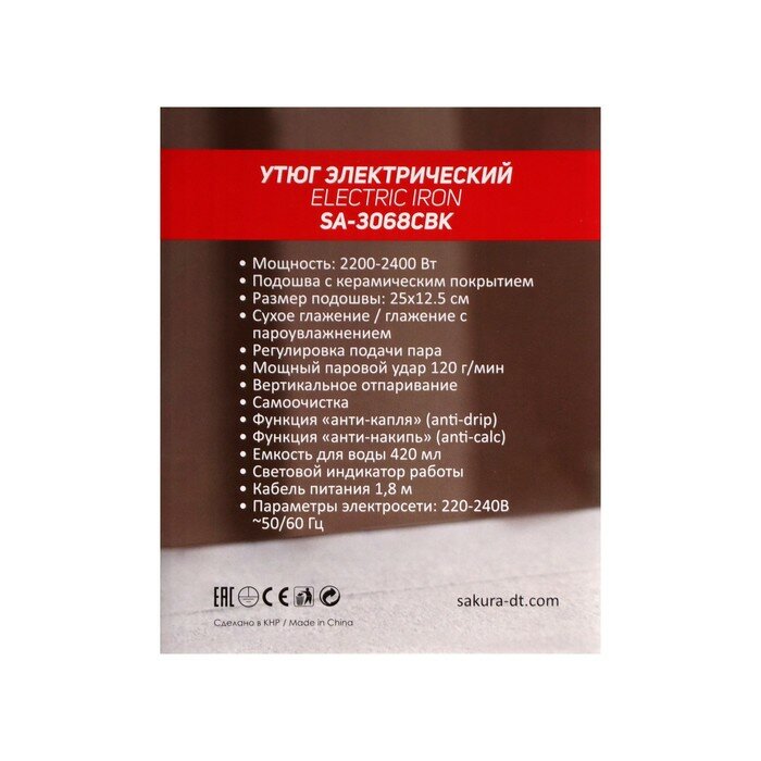 Утюг Sakura SA-3068CBK керамическая подошва, 2400Вт
