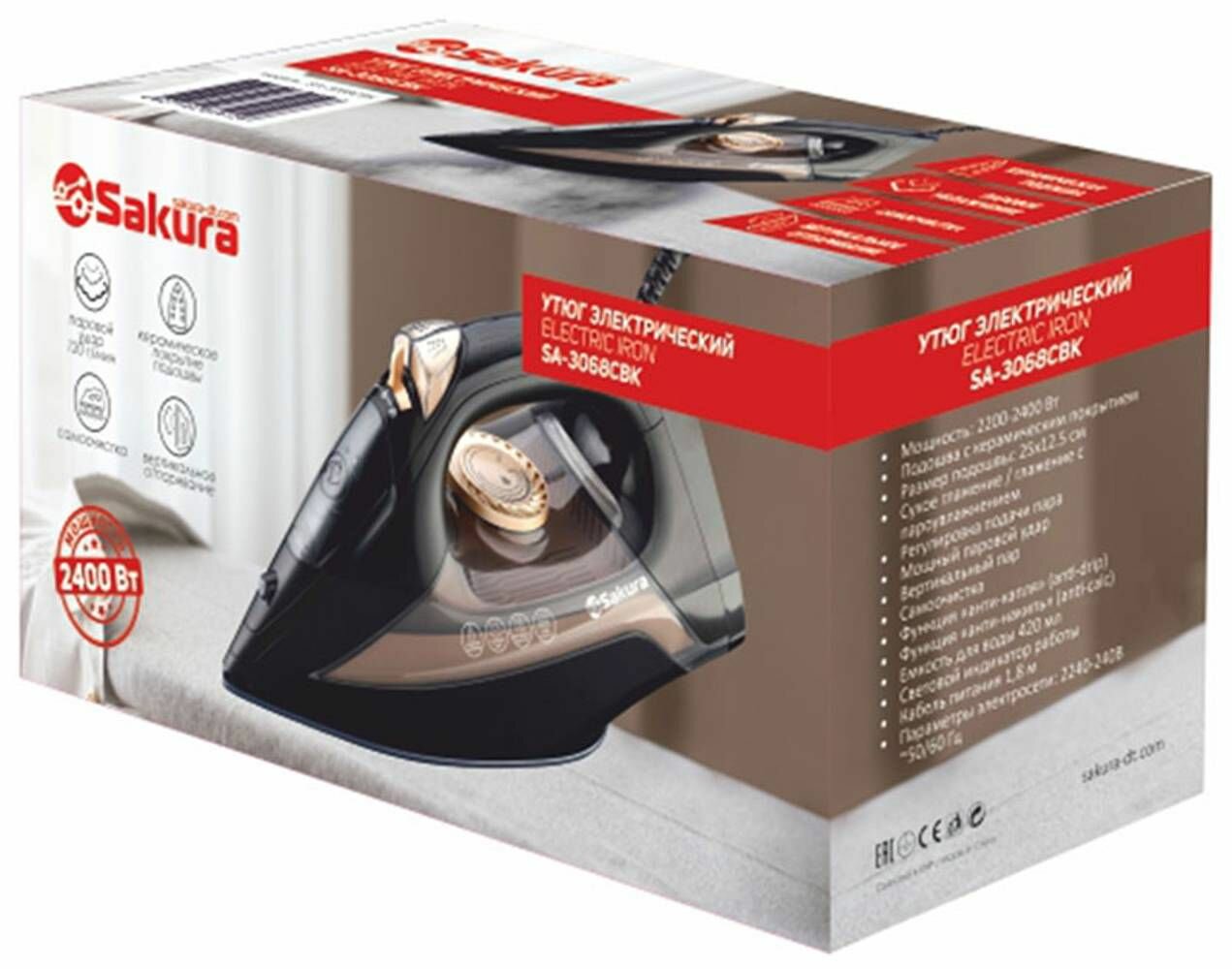 SAKURA Утюг Sakura SA-3068, 2400 Вт, керамическая подошва, 420 мл, паровой удар, чёрно-золотой