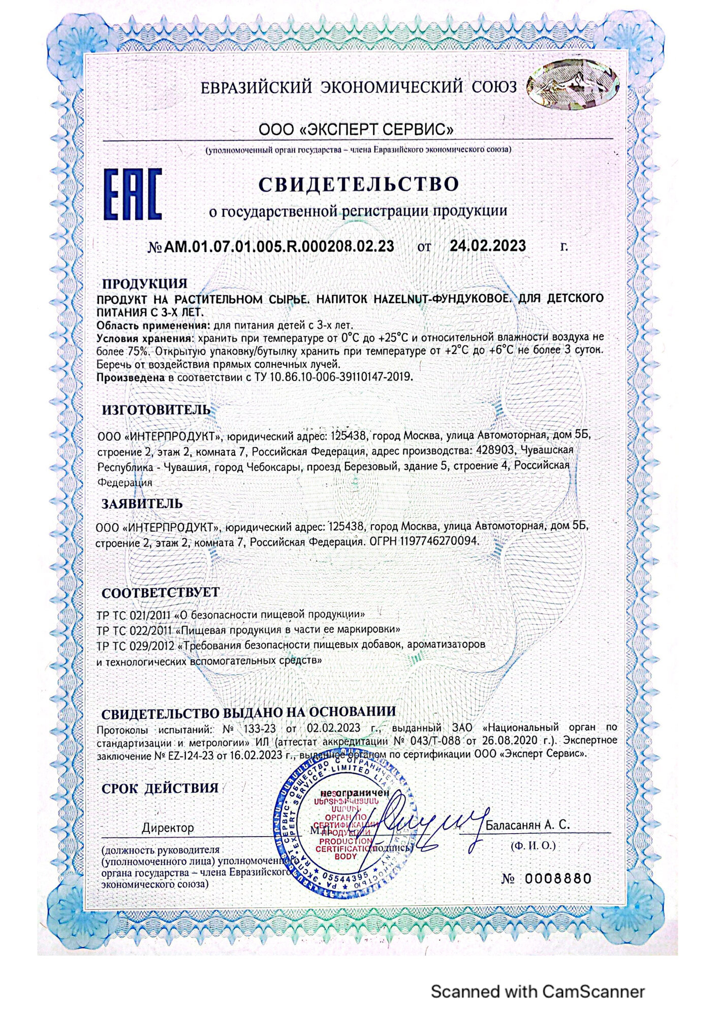 | Состав | орехово-злаковая основа (вода питьевая, рисовая мука, соевые бобы, ядра орехов фундука);вода питьевая, подсолнечное масло, регулятор кислотности- фосфат калия; эмульгатор-лецитин соевый; источник кальция- карбонат кальция; стабилизатор- геллановая камедь, соль морская пищевая, натуральный ароматизатор, витамины (В6, В12) |