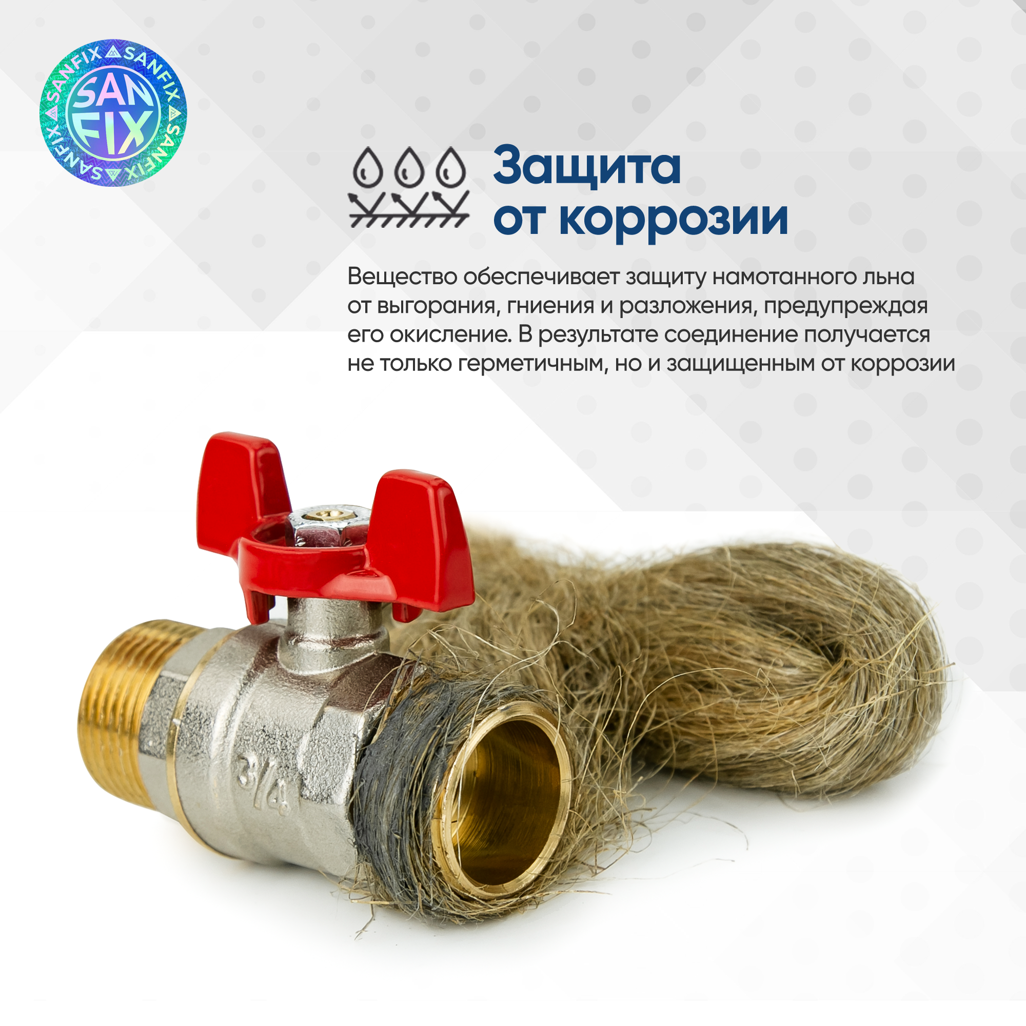 | Дополнительная информация | Паста SANFIX применяется вместе со льном или льняной нитью. Предварительно подготавливается и очищается от грязи и посторонних включений место резьбового соединения. Рекомендовано применение универсального очистителя SANFIX. Льняные волокна необходимо плотно намотать на резьбу, соблюдая равномерность намотки и направление в сторону шага. Участок должен быть покрыт по всей длине насечек. Паста наносится на лен ровным слоем, после чего собирается соединение. Лишний лен с пастой удаляются механически, попавшее на трубу или на руки вещество смывается водой. Трубопроводом можно пользоваться непосредственно после сборки. |