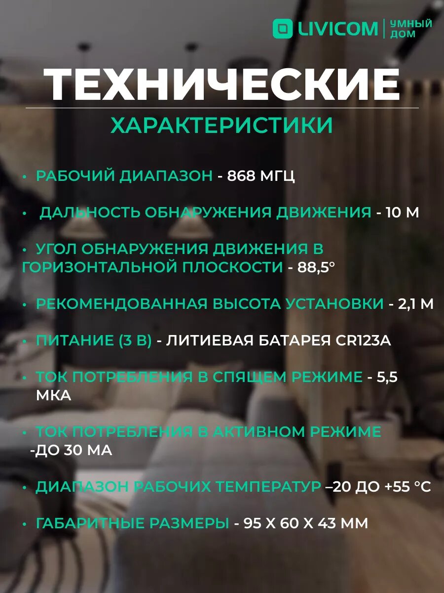 | Дополнительная информация | Рабочий диапазон 868 МГц, Рекомендованная высота установки 2,1 м, Диапазон рабочих температур –20 до +55 °С, Питание (3 В) литиевая батарея CR123A |