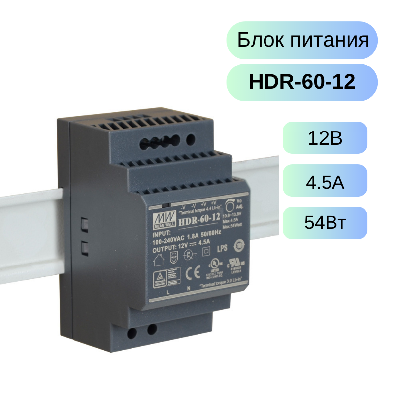 HDR-60-12 MEAN WELL Источник питания на DIN-рейку AC-DC, 12В, 4.5А, 54Вт