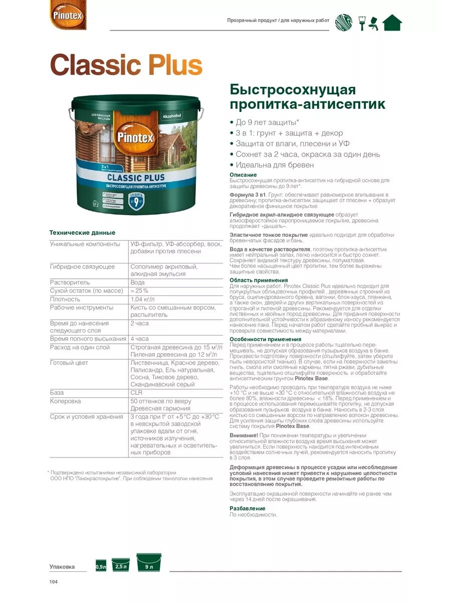 PINOTEX CLASSIC PLUS пропитка-антисептик быстросохнущая 3 в 1 лиственница 9л
