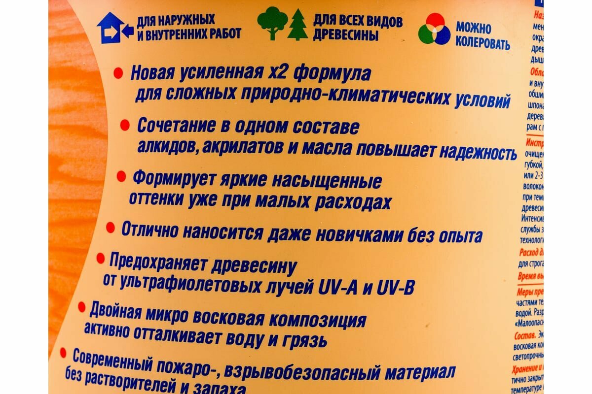| Особенности | УФ-защита, без запаха, быстросохнущая, водозащитная, декоративная, для использования в бане/сауне, невымываемая, с антисептиком |