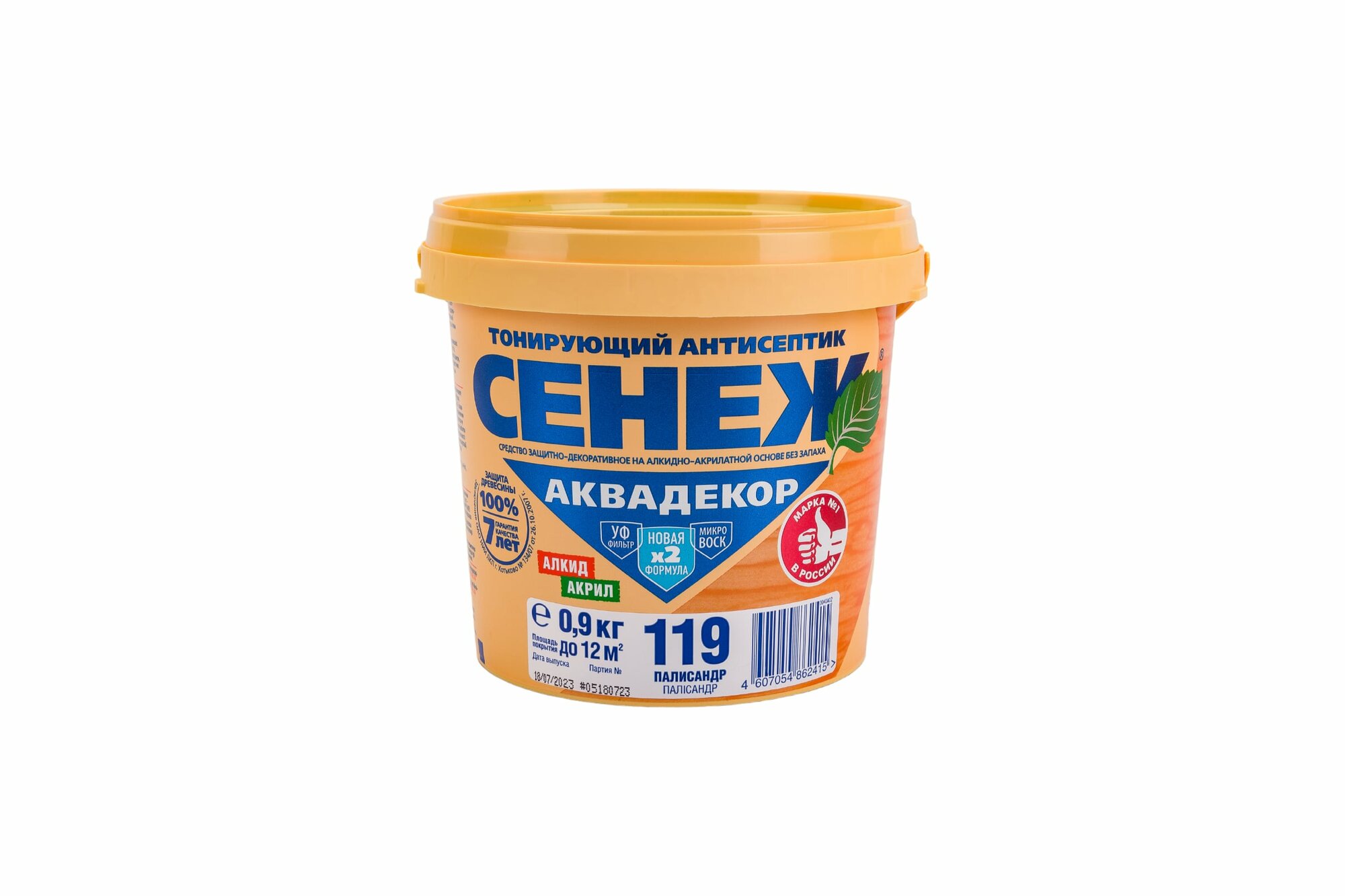 Сенеж аквадекор. Цвет 119 Палисандр. Тонирующий антисептик на алкидно-акрилатной основе с УФ фильтром и воском для долговременной защиты и отделки древесины. Ведро массой нетто 0,9 кг.