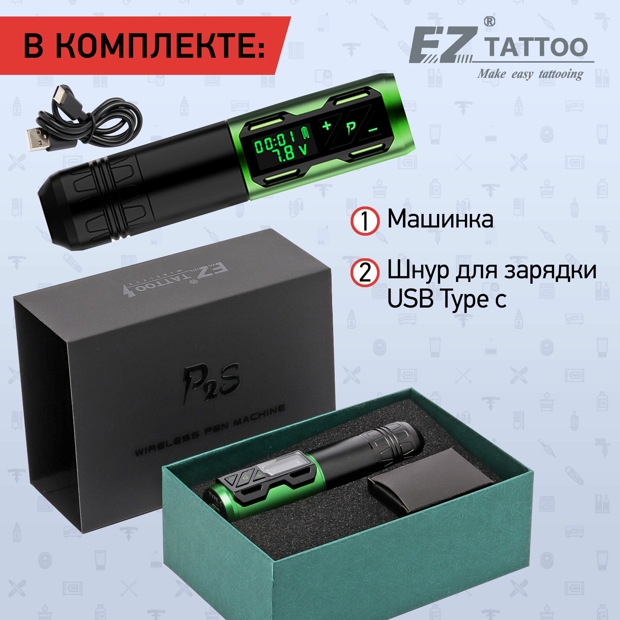 | Комплектация | аккумулятор;Адаптер для зарядки;USB-кабель для зарядки;Роторная тату машинка EZ P2S;коробка |