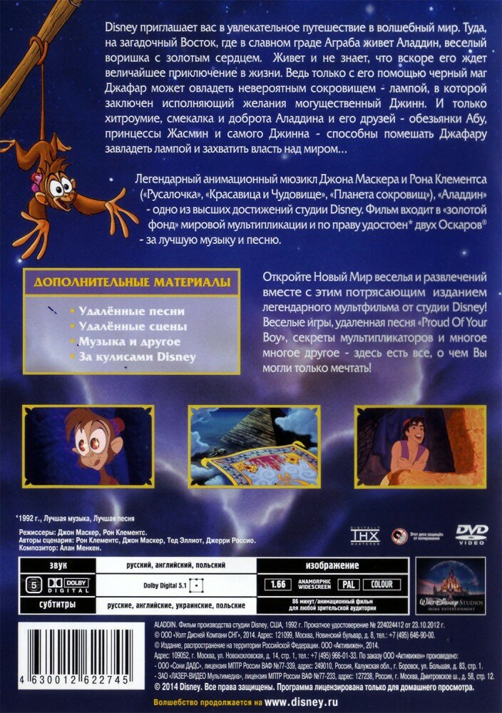 Аладдин (DVD) (1992 год, ДВД диск, DVD Box, США, Walt Disney Pictures) интересное:
