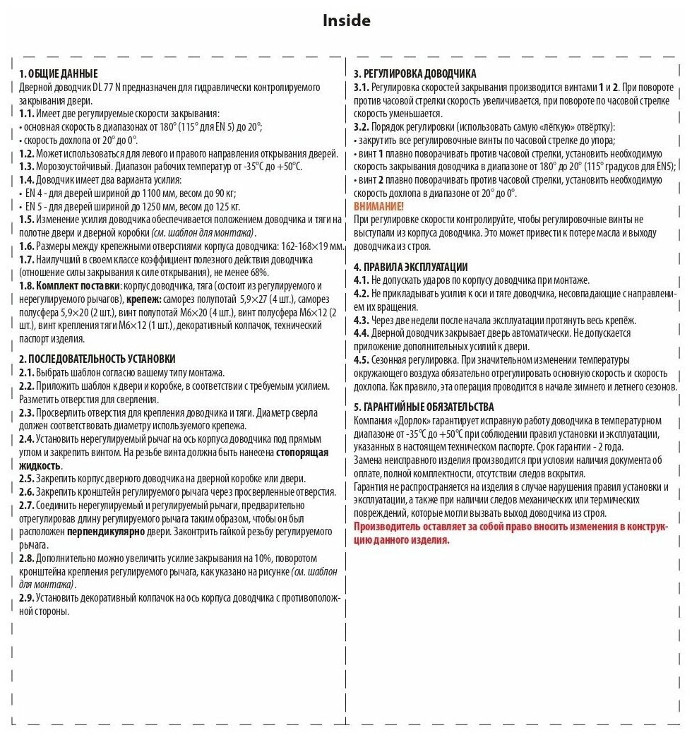 | Дополнительная информация | подходит для дверей от 65кг. до 125кг. |