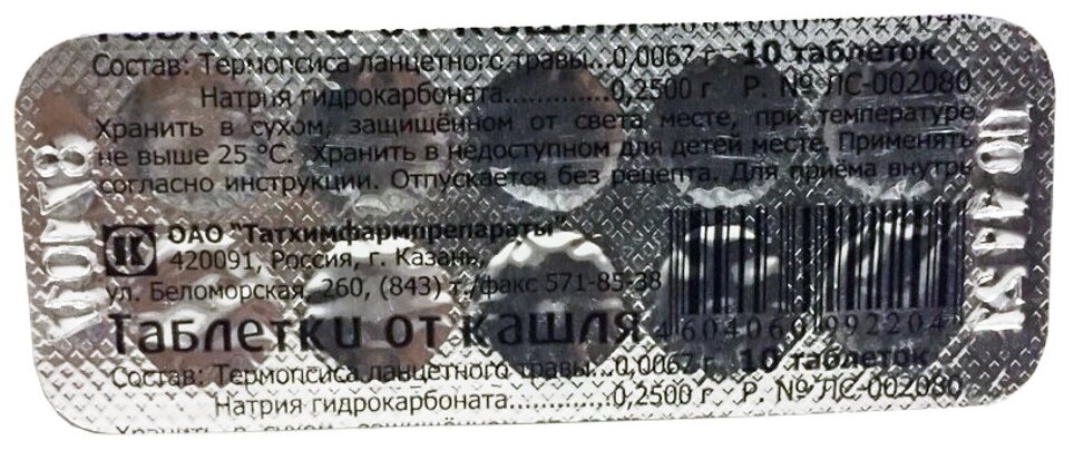 | Состав | 1 таблетка содержит: Действующие вещества: термопсиса ланцетного трава - 6,7 мг, натрия гидрокарбонат -250 мг. Вспомогательные вещества: крахмал картофельный, тальк. |