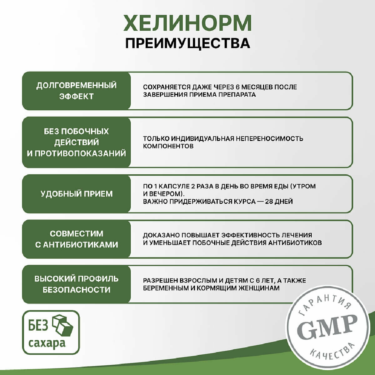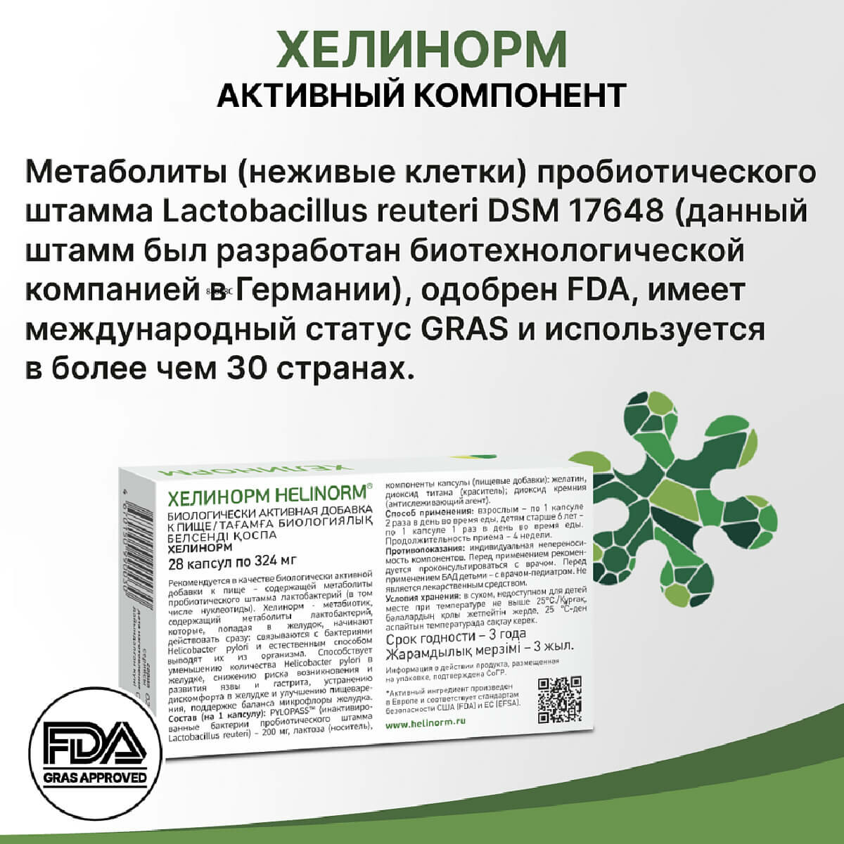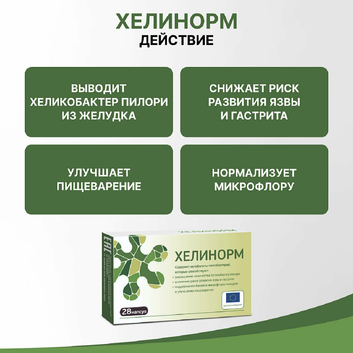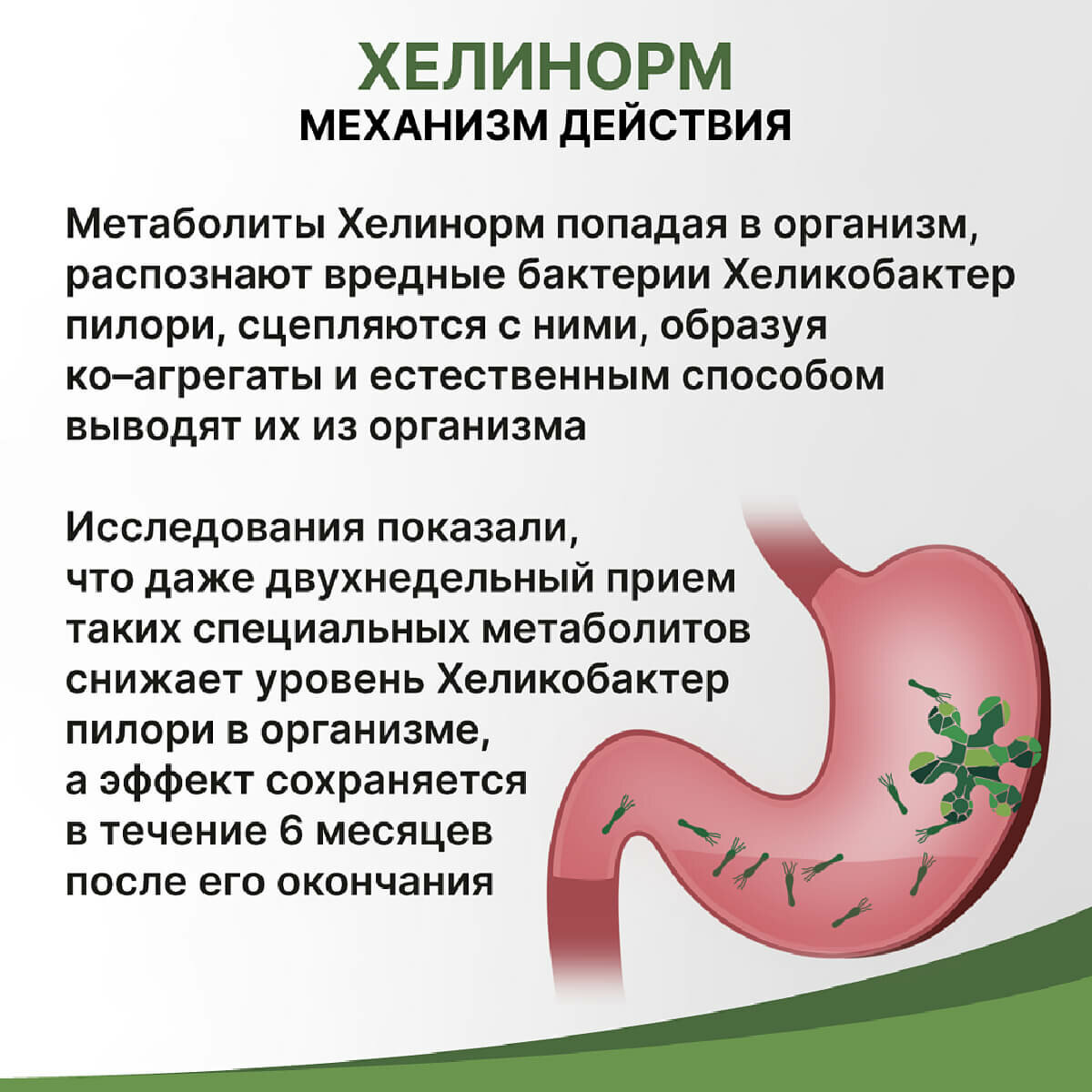 | Показания к применению | Рекомендуется в качестве биологически активной добавки к пище – содержащей метаболиты пробиотического штамма лактобактерий (в том числе нуклеотиды). Хелинорм – метабиотик, содержащий метаболиты лактобактерий (“PYLOPASS”), которые, попадая в желудок, начинают действовать сразу: связываются с бактериями Helicobaсter pylori и естественным способом выводят их из организма. Способствует уменьшению количества Helicobaсter pylori в желудке, снижению риска возникновения и развития язвы и гастрита, устранению дискомфорта в желудке и улучшению пищеварения, поддержке баланса микрофлоры желудка. |