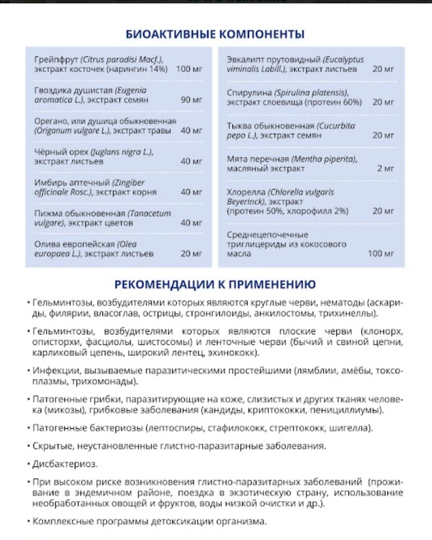 | Назначение | амебиаз / выведение токсинов / гельминтозы / кандидоз / лямблиоз / паразитарные заболевания / при глистных инвазиях / трихомониаз |