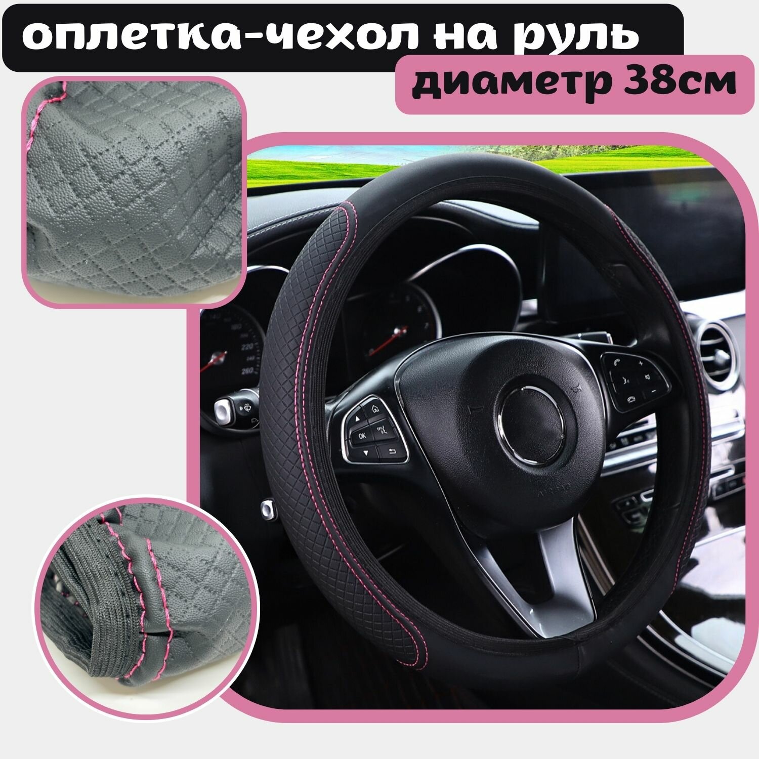 Купить Оплетка на руль из искусственной кожи черная/розовая размер М 37-39см