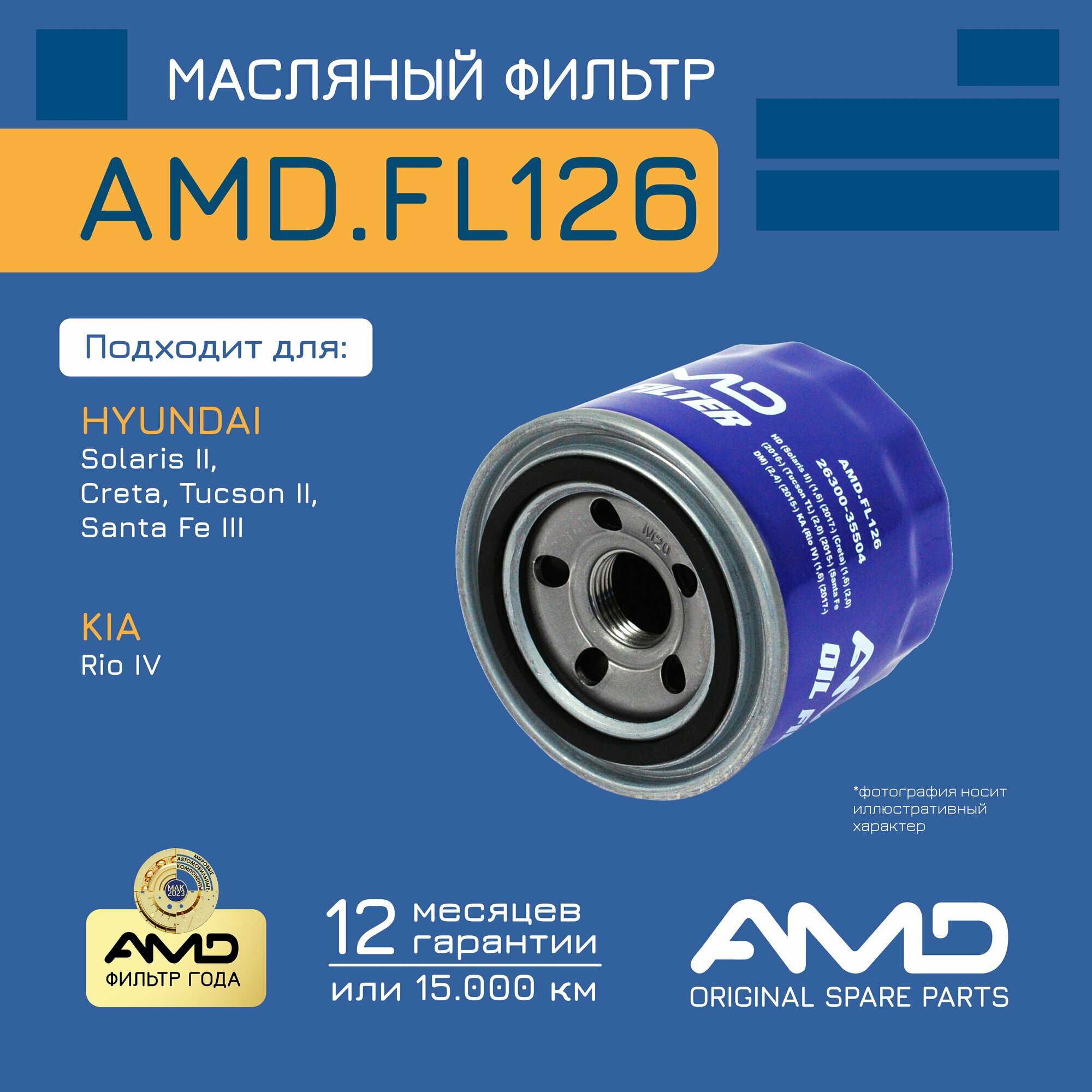 Фильтр масляный 2630035504 AMD. FL126 для HYUNDAI Solaris II 1,6 Creta 1,6 2,0 KIA Rio IV 1,6