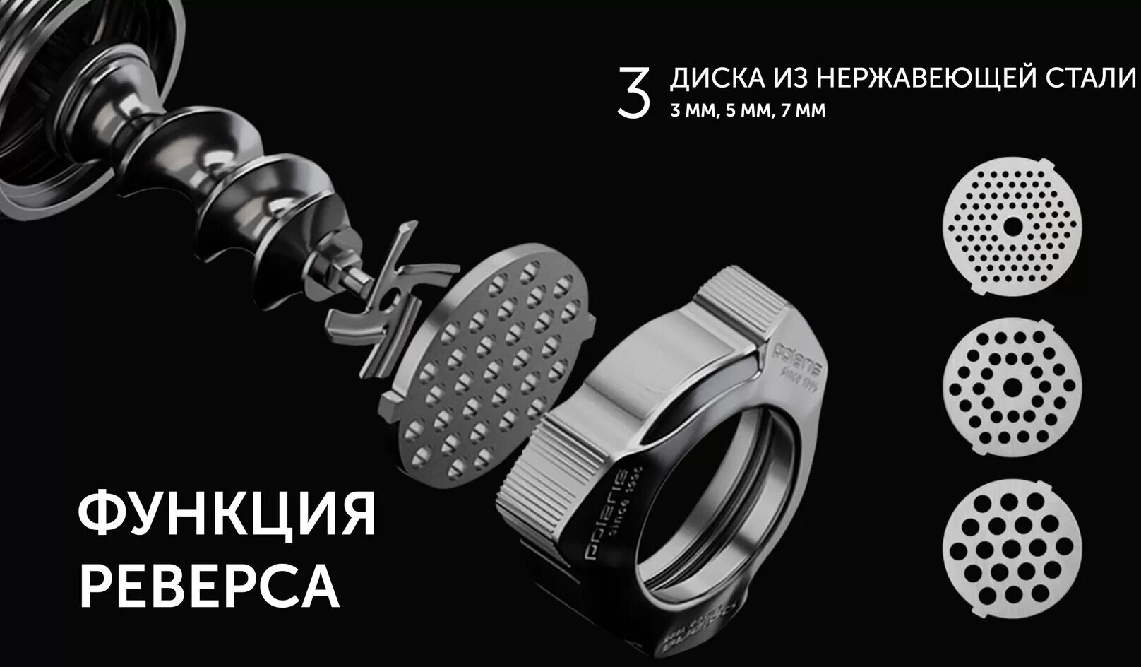 Мясорубка POLARIS PMG 1852, 1800Вт, производительность 2кг/мин, 2 насадки, реверс, бе