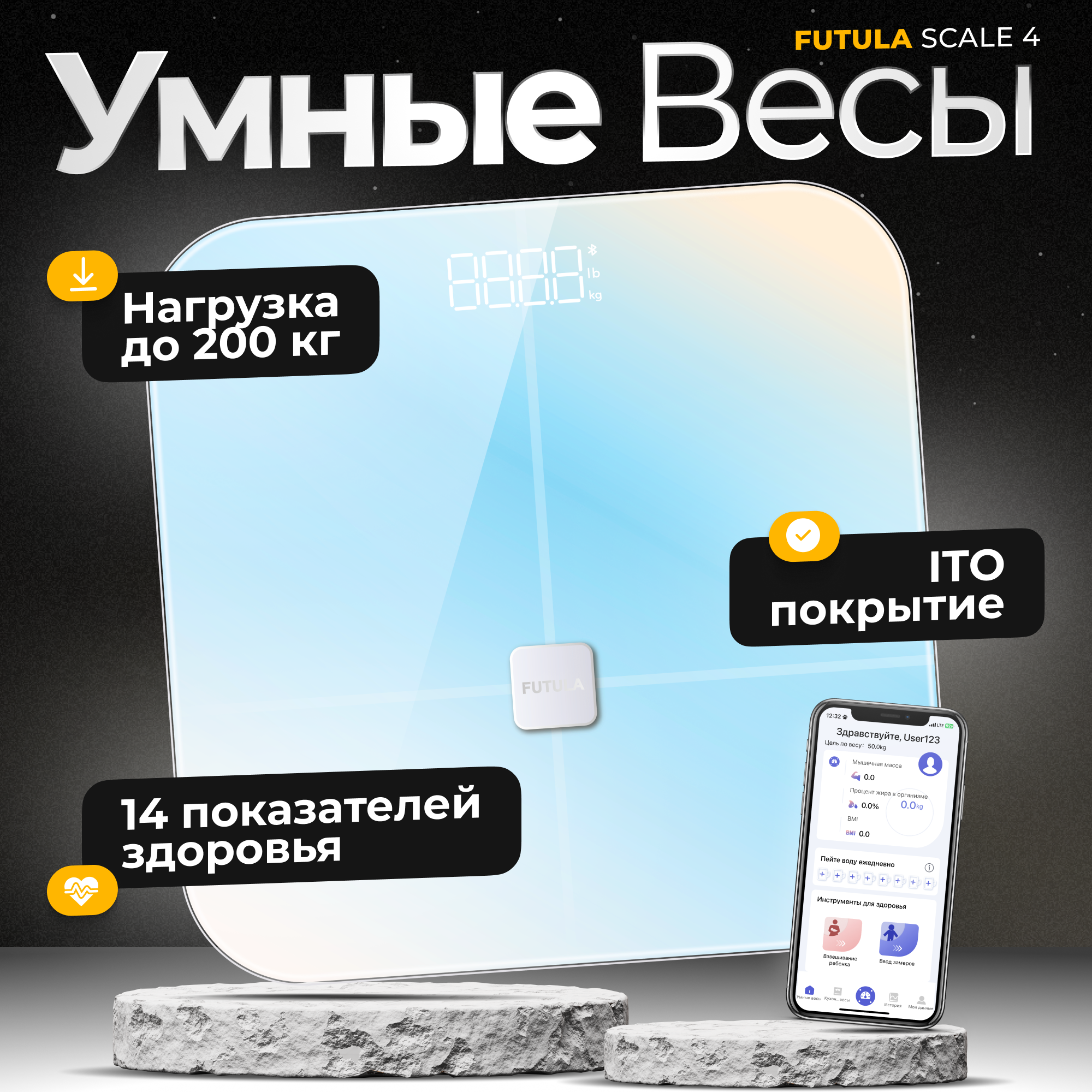 Умные весы напольные Futula "Scale 7", черные, точность измерения 1 г