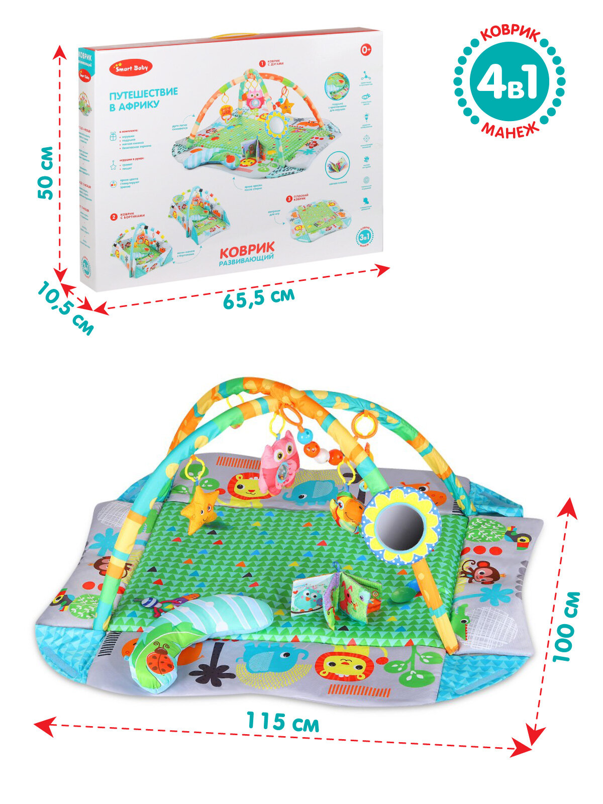 Детский развивающий коврик для малышей Джамбо Тойз "Путешествие в Африку", подвески-погремушки, коврик с бортиками, подушка, мягкий, голубой, JB0333587 интересное:
