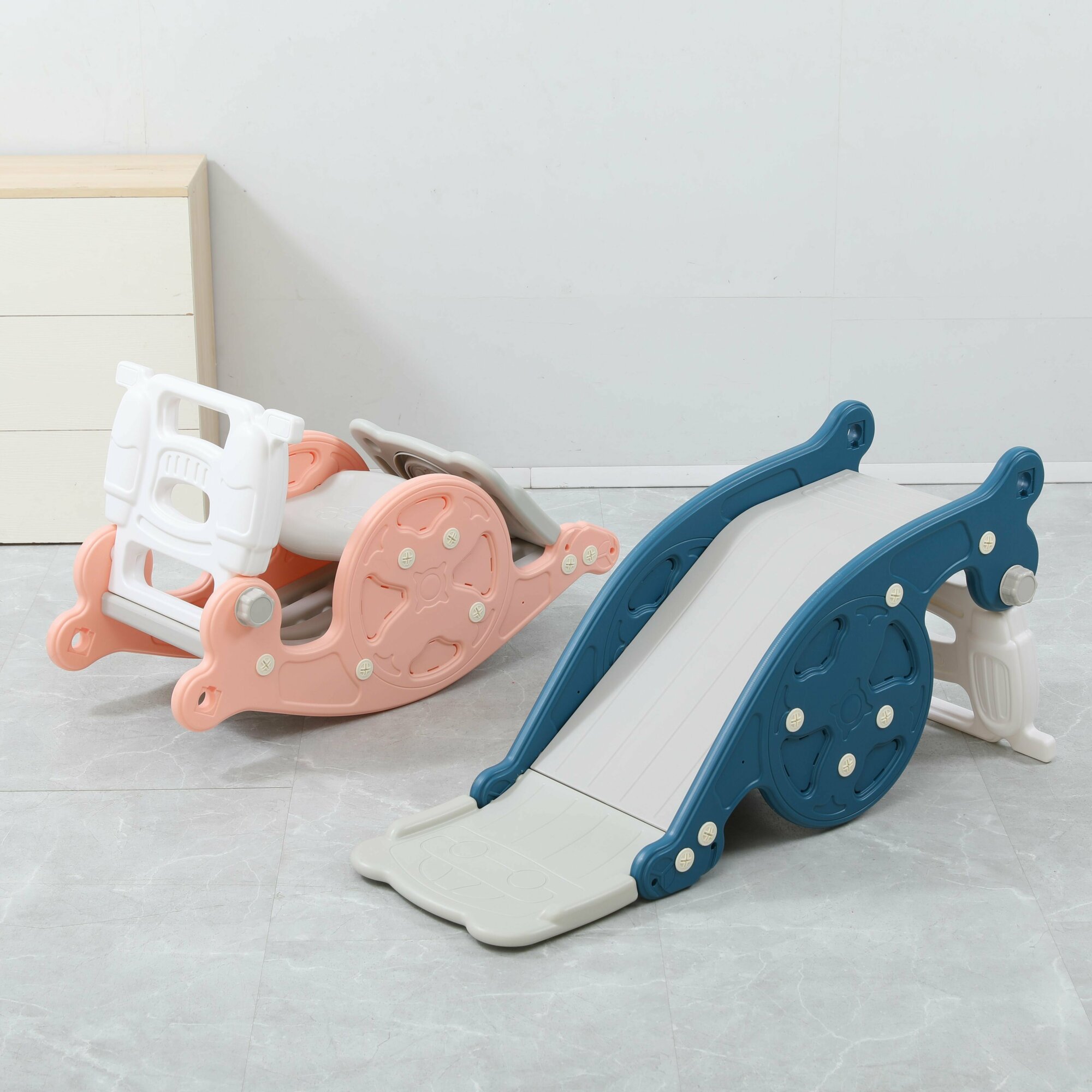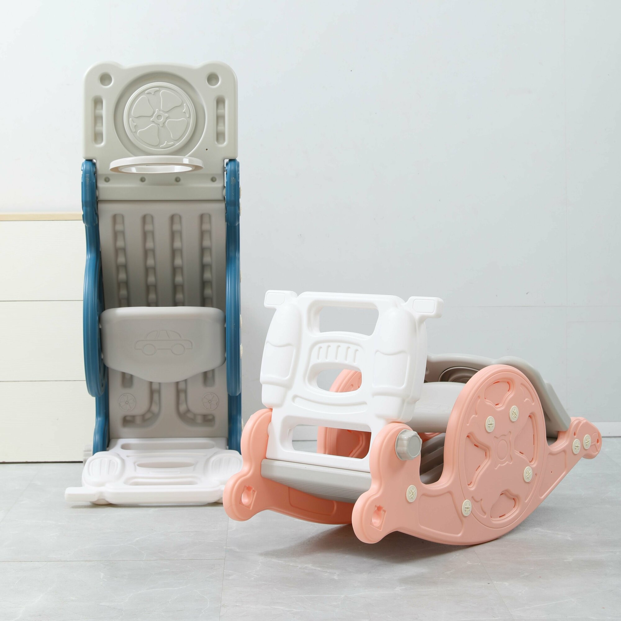 Горка-трансформер UNIX Kids Rose, со спуском 95 см, качалка-балансир, баскетбольная стойка, 100х42х45 см