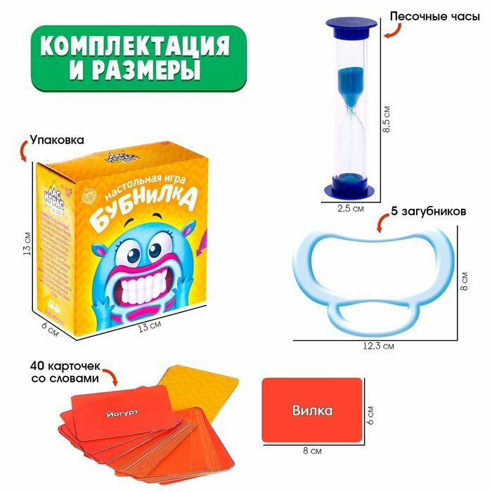 | Комплектация | 40 карточек, 5 загубников, песочные часы. |