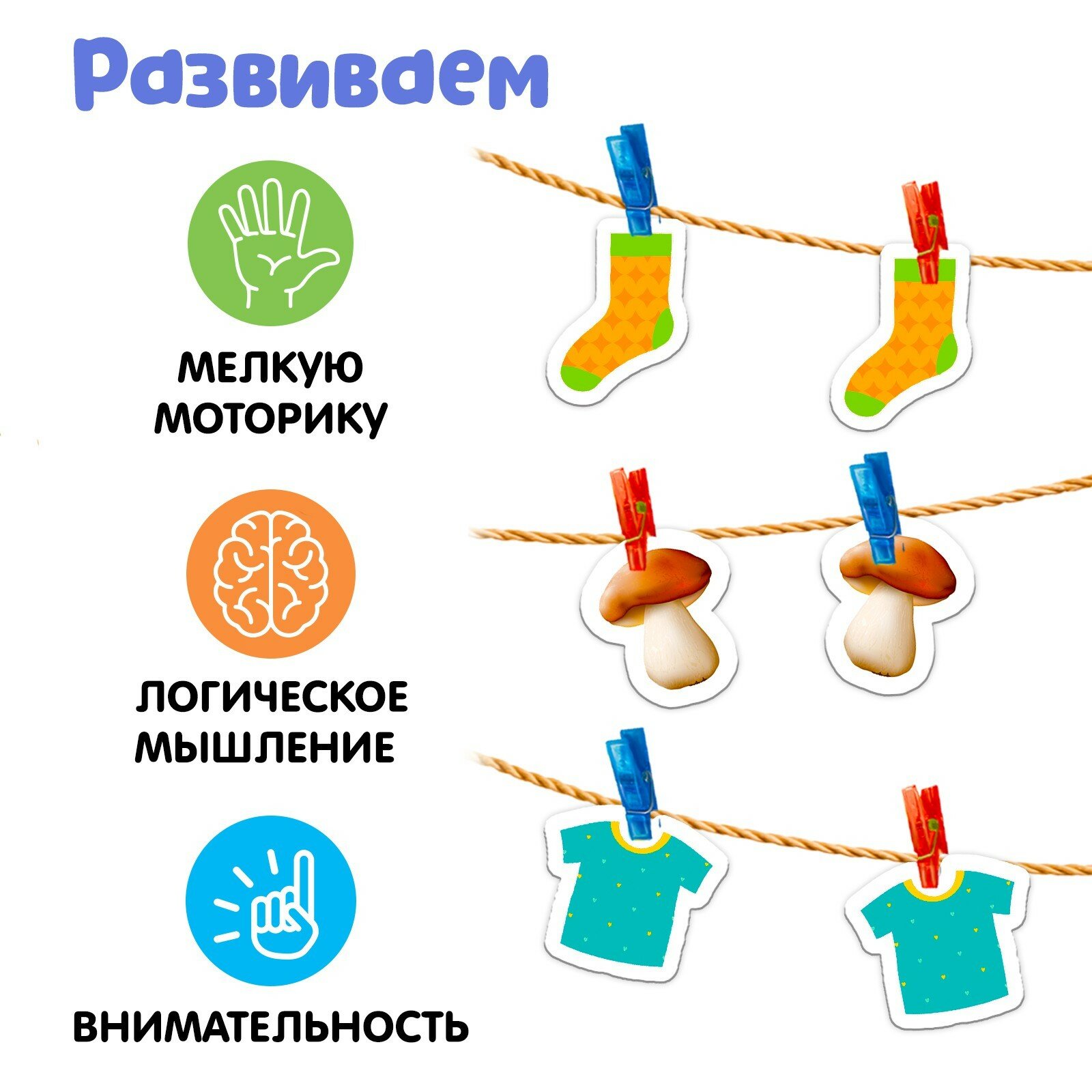 | Комплектация | 10 прищепок, шнурок, парные картинки |