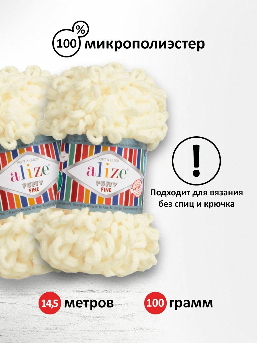 Пряжа Alize Puffy Fine -1 шт, 599 слоновая кость, 14 м/100 г, маленькие петли (2 см) /Ализе Пуффи файн/