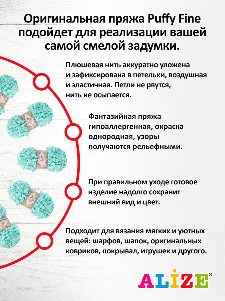 СохранитьПряжа для вязания руками с петлями ALIZE 'Puffy Fine' 100г, 14,5м (263 бирюзовый), 5 мотков интересное: