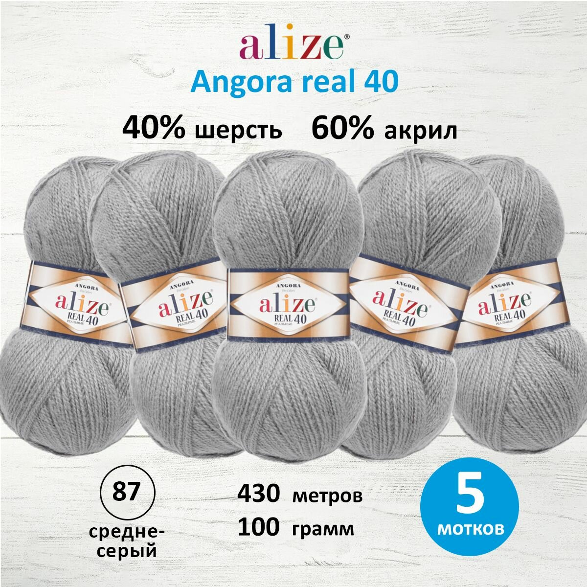 Купить Пряжа для вязания ALIZE 'Angora real 40', 100г, 430м (40% шерсть, 60% акрил) (87 средне-серый), 5 мотков