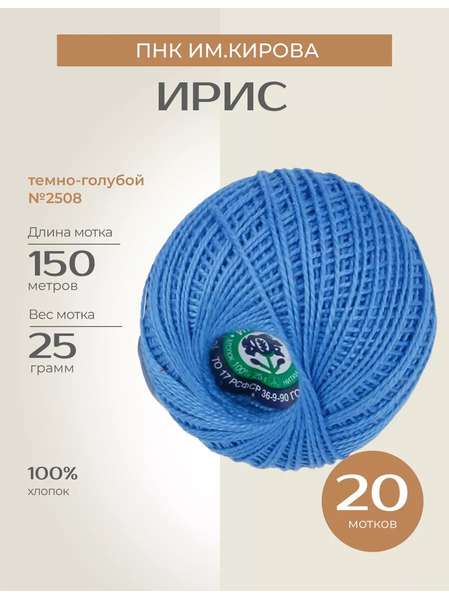 Пряжа ПНК им.Кирова Ирис тонкая мерсеризованный хлопок 100%, цвет №2508 темно-голубой 20 шт. по 25 г, 150 м