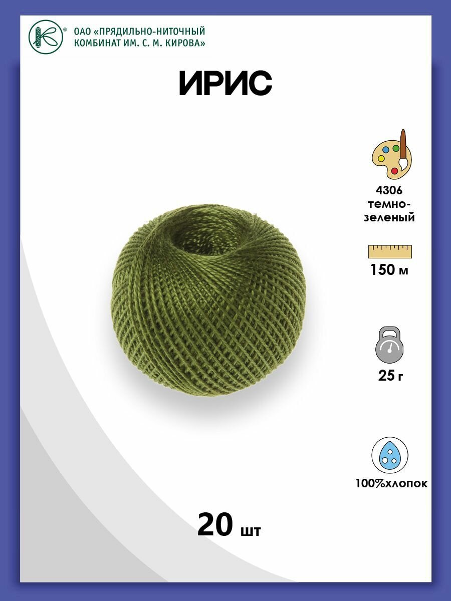 Нитки вязальные ПНК Кирова Ирис", 100% хлопок, 20 шт по 25 г, 150 м, цвет 4306, зеленый (ирис.4306)